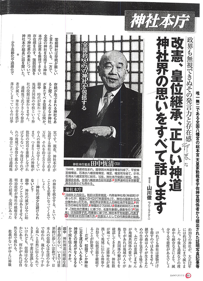 宗教法人神社本庁の闇(歴代天皇勅祭社宇佐神宮の声「会計検査院による宗教法人神社本庁と自民党神道政治連盟の検証をとの声」)、歴代天皇と日本国民の歴史認識(日本国憲法第一章天皇、第一条天皇の地位・国民主権の国益平和民主主義護憲による歴史認識)、注:1951年(昭和26年)9月アメリカ合衆国政府強要による日米安全保障条約の真相。